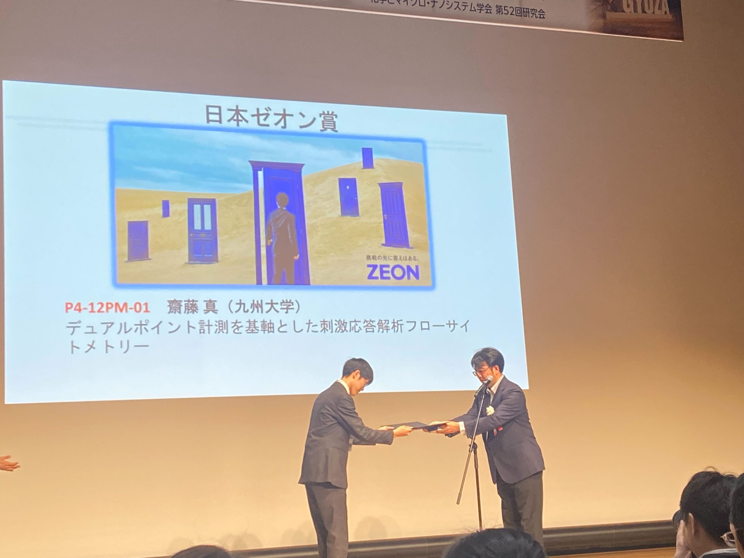 同時開催された第16回マイクロ・ナノ工学シンポジウムと化学とマイクロ・ナノシステム学会 第52回研究会にて太田先生, 鳥取先生, 齋藤先生, D2の木山君, M2の青艸君と南君, M1の黒木さんと三浦君が発表しました. そして鳥取先生が優秀研究賞, 齋藤先生が企業賞を受賞しました. また, 南君が受賞ファイナリストに選出されました.